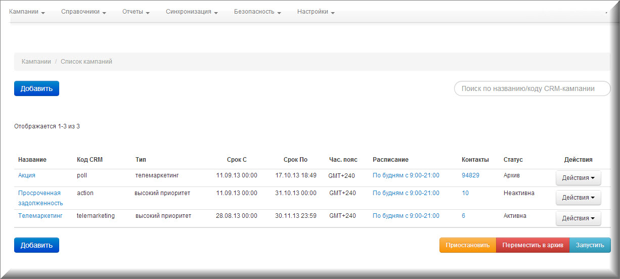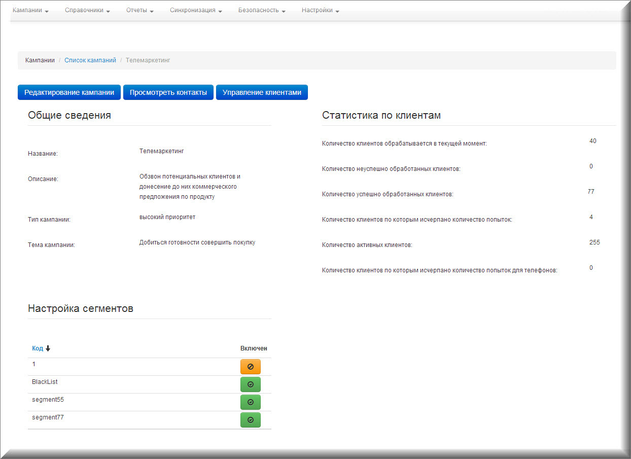 • контроль за ходом выполнения кампании (просмотр состояния обзвона контактов, получение краткой статистики по кампании);