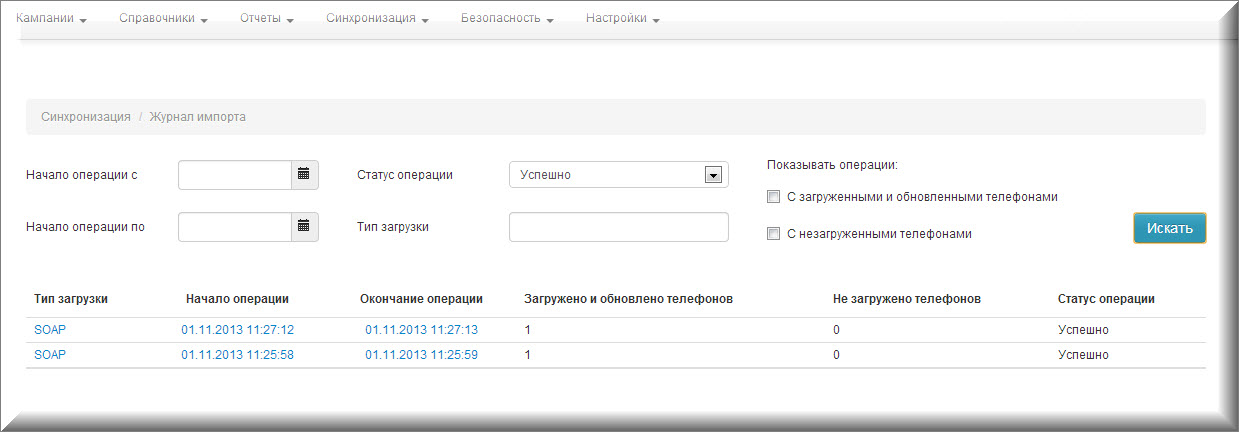 • наличие специальных журналов, с помощью которых можно отслеживать корректность выполнения операций импорта заданий на обзвон, а также экспорта листов обзвона в Cisco (фиксируется подробная информация об ошибках);