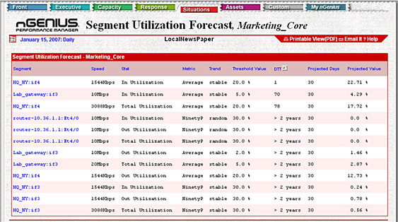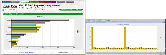 nGenius позволяет анализировать тенденции в увеличении загрузки каналов (в том числе, отдельными приложениями, сессиями, серверами), отображать профили использования сетевых ресурсов отдельными приложениями и контролировать превышение пороговых значений в загрузке каналов. Таким образом, nGenius осведомляет об увеличивающейся утилизации сетевых ресурсов до того как это начинает сказываться на качестве сервисов. nGenius позволяет выявлять профиль использования сети для каждого отдельного приложения, составлять прогноз утилизации каналов, анализируя тенденции, и помогает правильно планировать сетевые ресурсы, позволяя наглядно обосновать необходимость добавления новых емкостей (каналов, емкости каналов, перехода на более скоростную технологию).