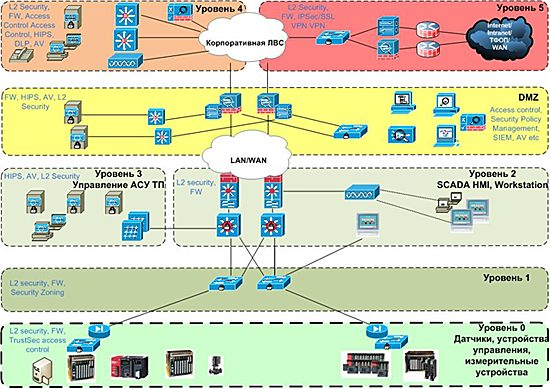 • Защита периметра, серверов SCADA, эшелонированный подход к обеспечению безопасности в соответствии с архитектурой Cisco SAFE для АСУ ТП;
