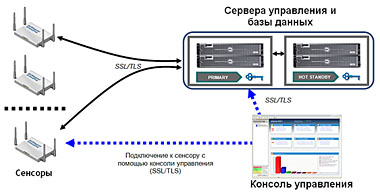 Обмен информацией между сенсорами, консолью управления и серверами управления происходит в зашифрованном виде.